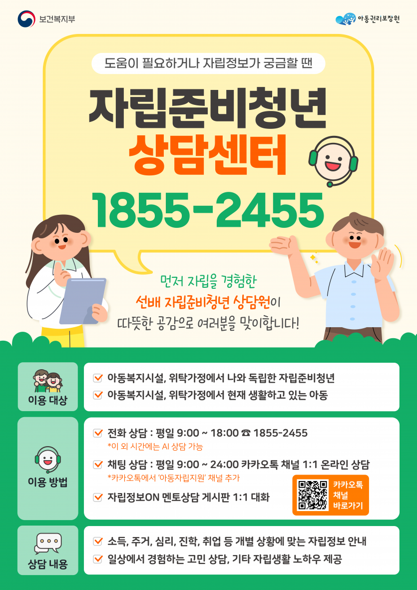 - 전화상담: 자립준비청년 상담 전용 번호 상담 (1855-2455) / 평일9 ~18시