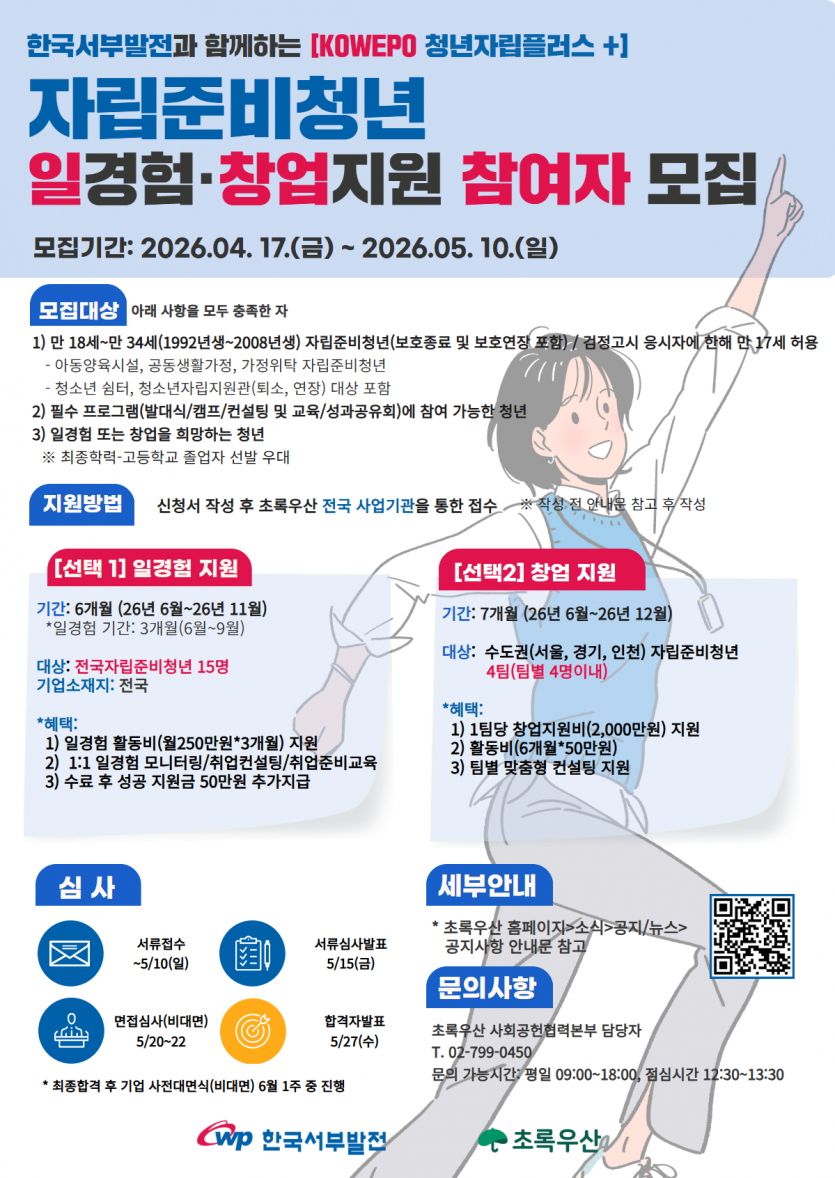 [자립] 한국서부발전 'KOWEPO 청년자립플러스+' 자립준비청년 일경험·창업지원 참여자 모집 안내 페이지 정보 작성자 : 관리자 조회수 : 14회 작성일 : 26-04-22 본문 안녕하세요.충남가정위탁지원센터입니다.한국서부발전 'KOWEPO 청년자립플러스+' 자립준비청년 일경험·창업지원 참여자를 모집합니다.많은 관심 부탁드립니다^^문의: 577-1226 목록 다음글[자립] 충남아동자립지원전담기관 보호연장아동 자립지원프로그램 26.04.22 댓글 0 댓글목록 등록된 댓글이 없습니다.