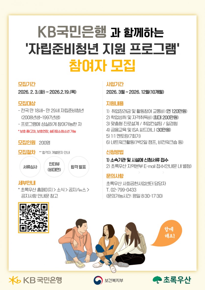 [자립] KB국민은행 '자립준비청년 지원 프로그램' 참여자 모집(~2.19.(목)) 페이지 정보 작성자 : 관리자 조회수 : 12회 작성일 : 26-02-04 본문 안녕하세요. 충남가정위탁지원센터입니다.KB국민은행 '자립준비청년 지원 프로그램'을 소개합니다.본 프로그램에 관심 있으실 경우, 센터 담당자에게 연락 부탁드립니다^^(T. 041-577-1226) 목록 첨부파일 붙임3. KB국민은행 자립준비청년 지원 프로그램 서류양식.zip (197.5K) DATE : 2026-02-04 13:11:46 다음글[자립] [CJ나눔재단,CJ취업연계] 2026 상반기 CJ도너스캠프 아카데미(~3.2) 26.01.30 댓글 0 댓글목록 등록된 댓글이 없습니다.